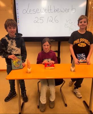 Ein Schüler bekam jedoch die meisten Punkte, da er vor allem den ihm unbekannten Lesetext sehr gut vorlesen konnte. Es handelte sich um Gabriel Garske aus der 6g1. Er gewann den ersten Platz und bekam zur Belohnung einen Büchergutschein des Buchladens Gundi Gaab in Bad Soden. Herzlichen Glückwunsch!