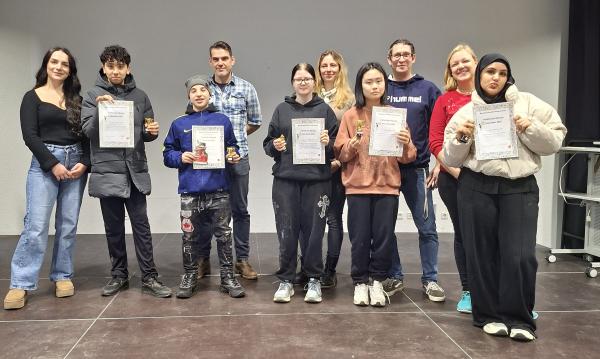 Ein Schüler bekam jedoch die meisten Punkte, da er vor allem den ihm unbekannten Lesetext sehr gut vorlesen konnte. Es handelte sich um Gabriel Garske aus der 6g1. Er gewann den ersten Platz und bekam zur Belohnung einen Büchergutschein des Buchladens Gundi Gaab in Bad Soden. Herzlichen Glückwunsch!